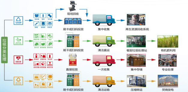 根據(jù)末端處理設(shè)施、小區(qū)情況、分類要求,實(shí)行可回收物、有毒有害垃圾、廚余垃圾、其它垃圾前端智能四分類全過(guò)程資源化處理,建立多樣化回收、集中收集、集中存儲(chǔ)、回收利用的標(biāo)準(zhǔn)化流程體系。