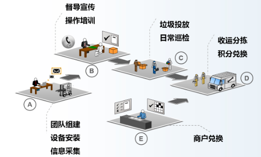通過智能垃圾分類設(shè)備和服務(wù)云平臺,包括(智能積分兌換發(fā)袋一體機(jī)、智能垃圾分類箱、智能垃圾分類可回收箱、有毒有害回收箱、手持終端、宣傳亭、云服務(wù)平臺、微信平臺、手機(jī)APP平臺等)對居民垃圾投放進(jìn)行智慧分類,從源頭管控垃圾分類投放,不僅可以提升居提投放正確率,更有效的解決傳統(tǒng)人力過多運(yùn)營的難題。