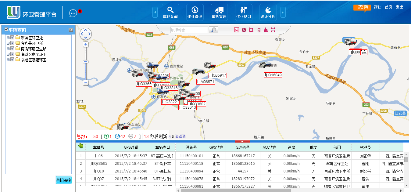(9)統(tǒng)計分析:主要是對于車輛作業(yè)、人員作業(yè)、垃圾收運、考核情況以及設(shè)施的各類數(shù)據(jù)信息進行智能化匯總和分析,制成數(shù)字和圖形報表,用柱狀圖和餅狀圖來顯示一目了然、突出重點、全盤分析。