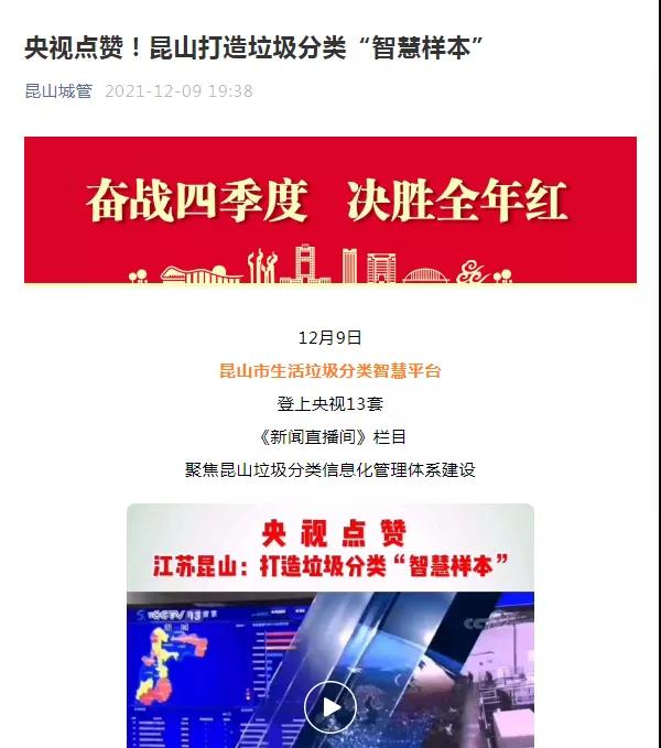 12月9日,CCTV13《新聞直播間》重點(diǎn)播報(bào)聯(lián)運(yùn)環(huán)境建設(shè)的生活垃圾分類平臺(tái)助力江蘇昆山打造垃圾分類“智慧樣本”!